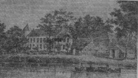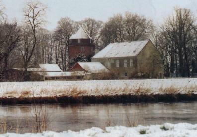 Das Amtshaus in Stickhausen um 1850. So hat es auch schon zu den Zeiten ausgesehen, in denen die in unserer Geschichte handelndenden Personen dort ein- und ausgingen. Der "Frachter" auf der Jümme ist eines der zahlreichen Boote von der Speditionshandelsflotte, die den Warentransport zwischen der Küste über die Fluß- und Bachläufe im Leda-, Jümme-, Ems- und Hasegebiet besorgte. (Bilder: Verfasser) |