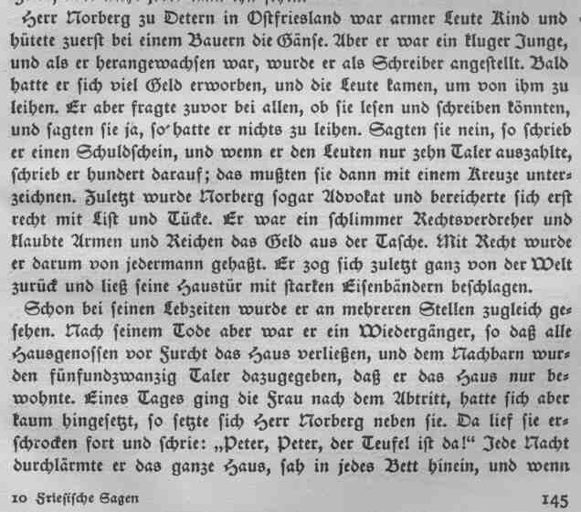 Nortberg, der den Sagenstoff lebte Histoorje un Redelköst ut't Kuntrei um't olle Amt Stickhusen Von Gerhard Bürjes, Stickhausen (Unser Ostfriesland Nr. 24, v. 27.12.1979) “Ji stolte Buren sünnt to dumm je ägen Naam to schrieven!" Was da so vorwurfsvoll über der Straße her klang, war nicht etwa der wütende Ausspruch eines Viehkaufmanns, der sich mit einem Bauern ob des Kuhhandels nicht einigen konnte, sondern diese Stimme kam aus dem Schulgebäude unter dem alten Glockenturm in Detern. Eingeweihte wußten: Lehrer van Dicken erzählt seinen Schulkindern wieder einmal die Sage vom Procurator Johann Nortberg. Heinrich van Dieken, vom 6. 5. 1877 bis l. 5. 1917 Lehrer in Detern, war für seine Erzählkunst bekannt. Trotzdem er meistens stark übertrieb, so hingen seine kleinen Zuhörer doch förmlich an seinen Lippen und vergaßen dabei Zeit und Raum. Ein ehemaliger Schüler berichtet über ihn: “Heinrich van Dieken (sein Bruder war der Fehnmeister Theo van Dieken in Stickhausen) war ein ausgezeichneter Kenner der ostfriesischen Geschichte und großartiger Erzähler. Auch ich bin von ihm in Heimatkunde unterrichtet worden und habe vor der gleichen bunten von ihm gefertigten Karte gesessen, auf der tiefblau die Jümme mit ihren zahlreichen Windungen eingezeichnet war und ihrer Vereinigung mit der Leda zustrebte. Er war zwar streng, aber wenn er nach dem offiziellen Teil zu erzählen begann, dann wurde die Zeit mit ihm zu einem Erlebnis. Man konnte dabei das Gruseln lernen. Damals hatten wir außer Mittwoch und Sonnabend auch nachmittags von zwei bis vier Uhr Unterricht, zweimal die Woche Heimatkunde von drei bis vier Uhr. Nicht nur wir vergaßen dabei Zeit und Stunde, auch van Dieken selbst. Sichtbar beeindruckt kamen wir mit erheblicher Verspätung nach Hause und die Mutter fragte: "Wor blievt ji, hett van Dieken wer vertellt?" Der alte Nortberg soll im Wirtshaus "Zum schwarzen Pferd" (heutiges Haus Bahns) den versammelten Bauern den o. g. Ausspruch der Sage nach entgegengehalten haben. Dieser Procurator Nortberg soll ein arger Leuteschinder gewesen sein. In einem alten Bericht heißt es: "Um diesen Namen wispert und raunt ein Heer von Gerüchten und Sagen. Das gilt für das ganze Alte Amt Stickhausen. Der Name zeitigt Variationen. Als ,Oll Noorbörg' geht er noch heute um." Zugereist als Feldscher auf Burg Stickhausen Johann Nortberg ist im November 1695 als Sohn des Anthon Noorborg und seiner Ehefrau Engel Kips geboren und am 27. November 1695 von Pastor Anton Heinrich Loewen-stein auf der Festung Stickhausen getauft worden. Einer seiner Taufpaten war Harmen Hueck, der Schulmeister auf Stickhausen. Er war das dritte von vermutlich 7 Kindern seiner Eltern. Die Nordborges stammen ursprünglich aus Groningen, von wo ein Gerd Nördborges im Jahre 1650 nach dem oldenburgischen Apen kam und als "Balbierer und Feldscher" (Barbier und Chirurg, Wundarzt) auf der dortigen Festung Dienst tat. Er starb am 22. September 1670. Sohn Stephan trat in seine Stellung als "Regimentsfeldscher". Dessen Sohn wiederum ist der oben erwähnte Anthon (Günther) Nordborges, welcher sich um das Jahr 1690 nach Stickhausen begibt und sich als "Mousquetier" auf der hiesigen Festung verdingt. Er wird am 30. März 1690 auf der Festung mit seiner Braut Engel Kips "copuliret" und gibt einige Jahre später den Beruf als Musketier auf und wird Handelsmann. Er stirbt am 19. September 1735 im Alter von 70 Jahren. Seine Frau Engel Kips folgt ihm am 24. September 1741 im Alter von 73 Jahren. Schnelle Karriere zum Procurator und Ausminer Johann Nortberg wächst inmitten seiner 6 Geschwister auf der Festung Stickhausen heran. Der einzige Bruder Stephan und eine Schwester sterben schön in jungen Jahren, zwei weitere Schwestern heiraten nach außerhalb, nur seine Schwestern Engel und Sophia Eberhardina bleiben im Lande und heiraten Deterner Bürger. Sophia Eberhardina den Schmied Lauth Rosendahl und Engel am 23. Mai 1724 den späteren Kaufmahn und Lakenhändler Johann Pauls Braken-hoff, der einige Jahre später als Heuermann auf der Holtgaster Schanze wohnt. Johann Nortberg selbst tritt als Erwachsener zunächst in die Dienste der fürstlichen Regierung und wird Schreiber beim Amt in Stickhausen. Hier hält es ihn jedoch nicht lange und schon im Jahre 1720 wird er als Procurator und ein Jahr später gar als "des Stickhausschen Amtsgerichts Wohlbestalter Procuratoris und Zollverwalter" betitelt. Die Stelle des Zollverwalters (mit Dienstsitz und Wohnung im vormals Tammena'schen Haus in Stickhausen) muß er jedoch nicht lange innegehabt haben, denn schon einige Jahre später wird er nur noch als Procurator und Ausminer bezeichnet. Er heiratet am 10. Mai 1720 "die Großehr- und Viel Tugendbelobte Jungfrau" Christina Magdalena Boleny, Schwester des Procurators und Ausminers Gustav Ulrich Bolenius in Detern und Tochter des Christian Boleny, "gewesenen Amptmann (1660 - 1676) dieses Ampts Stickhausen und hernach Hochfürstlichen Regierungs-Raths zu Aurich (gest. 1693) und dessen Ehefrau Elisabeth Glaan, Tochter des weyl. Hochedlen Herrn Bernhardi von Glaan, gewesenen Hochgräflichen Oldenburgischen Raths und Assessoris in Jever". Durch seine nunmehr ausgezeichneten Verbindungen zu hochgestellten Persönlichkeiten und Regierungsstellen, der Vetter seiner Frau ist der Bürgermeister von Esens und spätere Staatsrentmeister Christian Albrecht Carl von Glaan, Vater des spateren Stickhauser Amtmanns R. H. C. von Glaan, kommt Johann Nortberg in seinem Beruf schnell voran. Dieser berufliche Erfolg macht ihn jedoch menschlich zum Tyrannen, denn in der Folgezeit wird wenig erfreuliches mehr von ihm berichtet. Ein feiner Mann Aus seiner Ehe mit Christiana Magdalena Boleny entstammen 2 Kinder: am 10. Februar 1721 wird ihm ein Sohn, Christian Gustav, geboren, dessen Taufpate die "Frau Räthin Boleny", seine Schwiegermutter, ist. Als Zeichen der beruflichen und gesellschaftlichen Stellung des Johann Nortberg kann der bei der Taufe anwesende Pers
