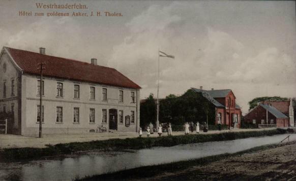 Westrhauderfehn. Als im Dezember 1895 die Gebrüder Lumiere auf einer Leinwand im Grand Cafe in Paris erstmals einen Zug fahren ließen, brach im Publikum noch Panik aus. Der Siegeszug des Kinos war dadurch aber nicht aufzuhalten. Schon 1913 wurde im Overledingerland das erste Filmtheater eröffnet. Es war Jelly Bahns, Inhaber des Hotels "Frisia" im Untenende von Westrhauderfehn, der es vielen Menschen ermöglichte, Asta Nielsen in "Abgründe" und andere Produktionen der deutschen Traumfabrik zu bewundern. Der Kino-Pionier vom Fehn sorgte seinerzeit auch für die musikalische Unterhaltung des Publikums. Denn als die Bilder laufen lernten, waren die Leinwandhelden noch stumm. Jelly Bahns spielte deshalb während der Filmvorführungen auf dem Klavier. 1933 starb er. Sein Enkel Joachim Bahns aus Rhaudermoor erinnert sich, daß das Hotel (Foto) von Fritz Bahns und seiner Frau Gerda übernommen wurde. Damals gehörten zu dem Unternehmen die Gaststätte mit Kegelbahn, das Hotel und das Kino. Mitte der 50er Jahre wurde das Hotel "Frisia" von Gerhard Nanninga gekauft. (GA v. 2.6.2001) |