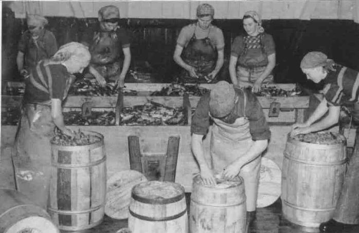 Wenn die Moorhantjes sich vor oder nach ihrer sommerlichen Akkord-Torfstukerei bei der Außenstelle des Arbeitsamtes in Westrhauderfehn arbeitslos meldeten (Ende der 50er/Anfang der 60er Jahre - es gab damals kaum Arbeitskräfte in Deutschland!) wurden die saisonalen Torfarbeiterinnen vielfach an die Leerer Heringsfischrei AG vermittelt, die dringend weibliche Arbeitskräfte zum Ausnahmen und Einlegen der Heringe benötigten. Diese Arbeit wurde ungern angenommen, da die Mädchen trotz aller Wascherei wochenlang nach Fisch rochen.  |