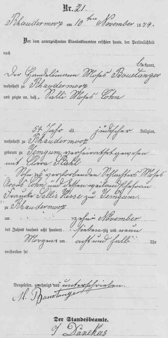 11.4. Sarah-Mahle Bundheim (*1831): Verheiratet mit dem Cousin Die jüngste Tochter des Emdener Elternpaares hieß Sarah-Mahle (sprich: Machle). Sie heiratete 1857 ihren Cousin Israel-Moses Bourtanger, der 1833 in Oude Pekela bei Bunde geboren war. Seine Mutter war eine Schwester der Gütel Mindus-Bundheim. Weiteres über diese Familie ist mir nicht bekannt. |