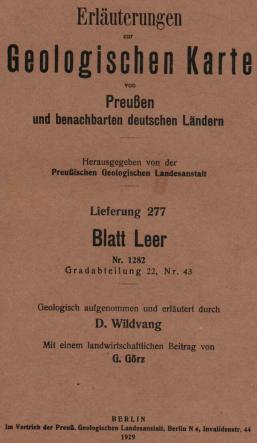 Geologische Übersichtskarte von Ostfriesland, 1:100.000. Bearbeitet von Dodo Wildvang in Emden. Herausgegeben von der Preußischen Geologischen Landesanstalt Berlin 1939. |