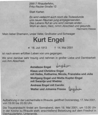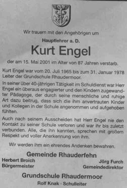 Kurt Engel wurde in Botterode, Thüringen, geboren. Er studierte Mitte der 30er Jahre an der Pädagogischen Hochschule Frankfurt, die später nach Weilbaurg an der Lahn ausgelagert wurde. - Um 1937/38 war Engel Junglehrer in Strackholt und kam dann nach Ostrhauderfehn oben. Über seine Soldatenzeit ist nichts bekannt. Nach dem Kriege begann er in Holthusen und kam von dort nach Rhaude. |