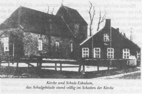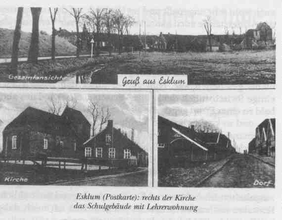Das Dorf Esklum mit damals etwa 250 Einwohnern liegt an der Leda, ungefähr l km oberhalb der Einmündung in die Ems. Der Name (Escelhem) weist daraufhin, daß hier schon in alter Zeit eine Siedlung auf gutem, fruchtbarem Marschboden angelegt wurde. Das alte Marschdorf liegt direkt im Schütze des Deiches. Durch einen Deichdurchgang gelangte man zur Fähre, die einen an die Stadtseite brachte, entweder mit dem Boot oder, wenn Fahrzeuge befördert werden mußten, mit der Pünte, die an einem Seil von dem Fährmann über den Fluß gezogen wurde. Bis zum Bahnhof Leer waren es etwa 2 km. Esklum war damals ein ausgesprochenes Bauerndorf (46 Bauernfamilien, 5 Handwerker, ein Kaufmann, ein Gastwirt, einige Bahnbeamte und Arbeiter). Bis 1918 hatte in der Gemeinde das “Interessentenwahlrecht” gegolten, d.h., die Anzahl der Stimmen war vom Vermögensstand und von der Steuerkraft abhängig. So hatten eigentlich bis dahin zwei "Interessenten", die beiden reichsten Bauern, die mehr Stimmen hatten als alle anderen zusammen, die Geschicke des Dorfes bestimmt, und da sie beide äußerst sparsam und nicht gerade sozial gesinnt waren, wurde in der Gemeinde für das Allgemeinwohl wenig getan, wenn das mit Kosten verbunden war, und das ist ja wohl immer der Fall. Diese Tendenz gab auch der Kommunalverwaltung nach 1918 weiterhin das Gepräge, die regierende Bauernpartei war konservativ und deswegen bestrebt, alles beim alten zu belassen. Mein Vorgänger - 39 Jahre Stelleninhaber - war bis 1923 jahrelang Gemeindevorsteher gewesen, aber als solcher nur ausführendes Organ der reaktionären Gruppe. Er hatte sich auch wohl sehr angepaßt und im Hinblick auf die zu erwartenden Widerstände auch kaum versucht, etwas zur Verbesserung der Verhältnisse zu unternehmen. So war das Schulgebäude mit Lehrerwohnung bei unserem Einzug in einem schlechten Zustand; Krieg und Inflation hatten natürlich mit dazu beigetragen, daß in baulicher Hinsicht nichts geschehen war. Nun gab es unter den Bauern auch einige fortschrittlich denkende Vertreter, die sich dann auch bald zu einer Front gegen die alte reaktionäre Gruppe formierten, und so kam es bei den Wahlen immer zu unerfreulichen Auseinandersetzungen, so daß das kleine Esklum ein sehr unfriedliches, zerstrittenes Dorf war, was für mich in meiner Stellung als Lehrer, der ja Kinder aus beiden Gruppen zu unterrichten hatte, eine ständige Belastung gewesen ist. Ich habe mich bemüht, mich aus der Gemeindepolitik völlig herauszuhalten, als Lehrer und Erzieher der Jugend menschliche Kontakte nach allen Seiten zu pflegen. Daß ich mich dabei immer wohl gefühlt habe, kann ich nicht sagen. Die Marschsiedlung war ein typisches Haufendorf, angelegt auf einem guten Quadratkilometer mit 30 Gebäuden, also war bei einigen Häusern recht wenig Platz. Vielleicht ist es auch eine Quelle des Unfriedens, wenn Menschen auf engem Raum zu nahe beieinander wohnen. Das Schulhaus stand am Westrand der Siedlung, ein paar Meter südlich davon die Kirche mit Friedhof und wieder südlich davon das kurz vor dem ersten Weltkrieg erbaute Pfarrhaus, ein zweistöckiges Gebäude mit einem weißen »Kragen« im Oberteil, das in seiner Umgebung wie ein Fremdkörper wirkte. Das niedrige Schulhaus stand tatsächlich im »Schatten der Kirche«, es bekam vormittags etwas Sonne von Osten, aber nachmittags verhinderte die Kirche das Eindringen des Sonnenlichts, und von Westen her schien die Sonne nur auf Scheune und Schulklasse, soweit die hinter dem Gebäude stehenden alten Linden das zuließen. Das Schulhaus war ein niedriges, nach meiner heutigen Schätzung 16 bis 18 m langes Gebäude, in Anlage und Zustand geradezu armselig, so daß wir uns in der Rückschau immer wieder wundern, daß wir es dort über elf Jahre ausgehalten haben. Ein Hauptgrund war wohl die Nähe der Stadt, wodurch man das beruhigende Gefühl hatte, nicht so weit abseits zu wohnen und an manchem teilnehmen zu können, was in einer abgelegenen Stelle nicht möglich gewesen wäre. Allerdings war zwischen Dorf und Stadt immer das Wasser, und das konnte bei Sturm und Eisgang eine Absperrung bedeuten. Als letzte Möglichkeit blieb im Notfall die Eisenbahnbrücke, eineinhalb Kilometer vom Dorf entfernt, an der ein Fußweg entlang führte, der aber als öffentlicher Fußweg nicht anerkannt und zudem ein beträchtlicher Umweg war. Meine Frau hat sich mit den Fährverhältnissen nie recht abfinden können. Zur Beschreibung des Dorfes wäre noch nachzutragen, daß zur Gemeinde Esklum auch die Ortschaft Heerenborg gehörte, westlich und östlich des Bahnkörpers (Leer-Jhrhove-Papenburg) gelegen, am weitesten nach Osten dann noch der Bauernhof Sprickenborg, bewirtschaftet von einer Bauernfamilie mit einer großen Kinderschar, der wir besonders verbunden waren und noch sind. |