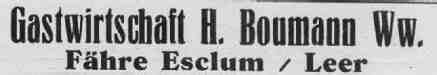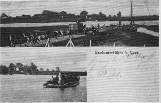 Die Esklumer Fähre ist schon vorhanden, seit dem jenseits der Ems und Leda das Kloster Muhde existierte. Von dort führte ursprünglich die Püntenverbindung nach Leerort. Dem Drosten Eggerich Beninga mißfiel die Fähr- verbindung mitten durch das Festungsgelände von Leerort, und er verlegte deshalb die Fähre etwas weiter leda- aufwärts nach Esklum. Das geschah im Jahre 1558. - Den Fährbetrieb besorgten Fährknechte, die die Pünte entlang einer Stahltrosse über den Fluß zogen. Nach dem Bau der Ledabrücke bei Tjackleger, Anfang der 30er Jahre, wurde der Fährbetrieb eingestellt. (Postkarte, aus: Johannes Röskamp, So war es damals. Leer 1983, S. 93) |