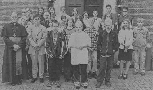 Das Sakrement der Firmung empfingen jetzt Jugendliche der katholischen Kirchengemeinde St. Bernhard in Flachsmeer. Weihbischof Theodor Kettmann aus Osnabrück nahm die Segnung der Firmlinge vor. In einem Gespräch vor dem Gottesdienst hatten sie Gelegenheit, mit dem Weihbischof ihre persönlichen Anliegen zu besprechen. Kettmann erklärte, er sei seit kurz vor Ostern in Ostfriesland unterwegs, um Jugendliche zu firmen. "Firmung" stamme vom lateinischen "firmare" und bedeute Stärken. Durch die Firmung soll Gott die Jugendlichen stärken und ihr Leben unter ein schützendes Dach stellen. Foto: Walker (GA v. 29.6.2000) |