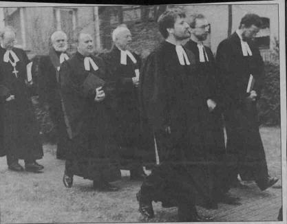 Alfred Spekker aus Flachsmeer (3. von links) erhielt jetzt im thüringischen Dittersdorf seine Ordination durch den Landesbischof Roland Hoffmann (links). Der 33-jährige Spekker wurde gleichzeitig als neuer Pfarrer der Kirchengemeinde Dittersdorf im östlichen Landesteil Thüringens eingeführt. Zu Gast waren dabei auch die Pastoren Michael Thiel (ehemals Ostrhauderfehn) und Wilhelm Hellmers aus Holterfehn (rechts im Bild). Bei der evangelisch-lutherischen Kirchengemeinde in Osrhauderfehn hatte Alfred Spekker bis zum Mai dieses Jahres sein Vikariat absolviert. Der gebürtige Flachsmeerer ist schon seit dem l. Dezember mit seiner Frau und den drei kleinen Kindern ins Pfarrhaus nach Dittersdorf umgezogen. (-ra / GA-Leserfotov. 28.12.2000) |