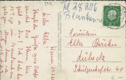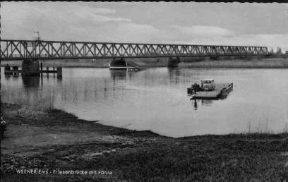 Postkarte aus dem Jahre um 1950; sie wurde am 24. Juli 1961 geschrieben: Die abgebildete Eisenbahnbrücke, deren Mittelteil klappbar ist, bereitet den Ingenieuren der Meyer-Werft immer wieder wegen der geringen Öffnungsbreite technische Probleme (heute schneidet man einfach einen Teil aus der Brücke aus!), wenn die riesigen Luxus-Schiffe über die Ems nach Emden oder Eemshaven zur Endausrüstung überführt werden sollen (siehe: www.papenburg.de/fremdenverkehr). |