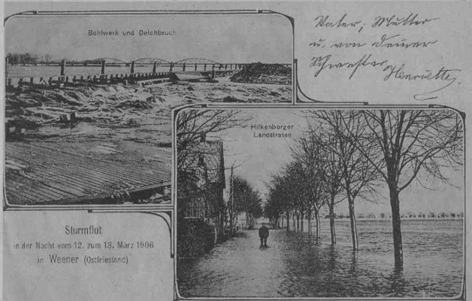 Großen Schaden richtete eine Sturmflut an, die sich 1906 über den Ort Wener von Hilkenborg aus ergoß. Das als Ankerplatz am Emsdeich erbaute Bollwerk wurde vom Sturm losgerissen. Deiche brachen, Straßen und Felder wurden überflutet. Foto: Ansichtskarte aus der Sammlung Onno Folkers, zu sehen in der OZ v. 1.9.2000. |